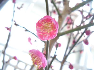 テモに飾った梅の花は暖房のお陰が花を咲かせて、すっかり春模様デス。